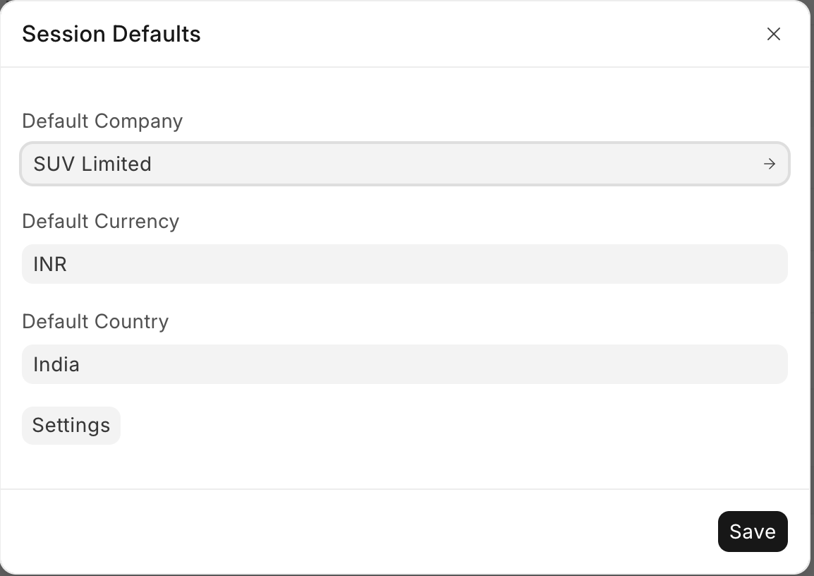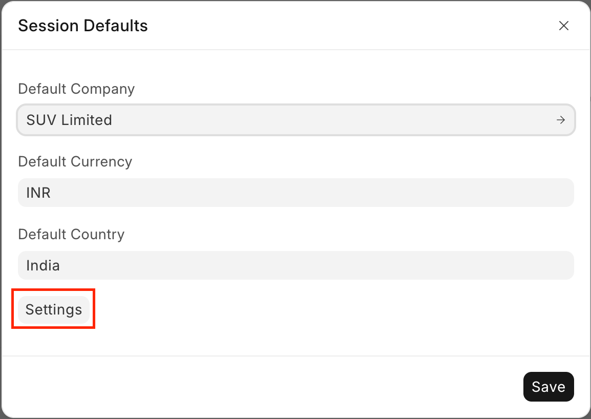 The Settings button is only visible to the System Manager or to a person having permission to access 'Session Default Settings'. This button navigates you to Session Default Settings where you can add or remove the document types for which you want to set Session Defaults.
