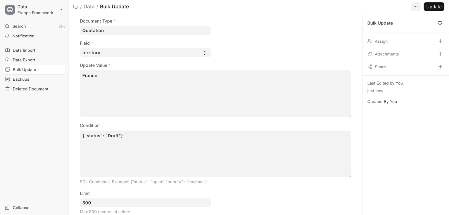 Consider that you have 20 quotations in which you had selected 'All Territories' and now you want to change the Territory to France. Instead of updating the individual quotations manually, you can use Bulk Update to update all 20 Quotations at once.