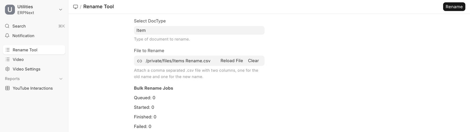 Select the DocType that you want to rename. Here, DocType will be Item. Then browse and upload the data file and click Rename.