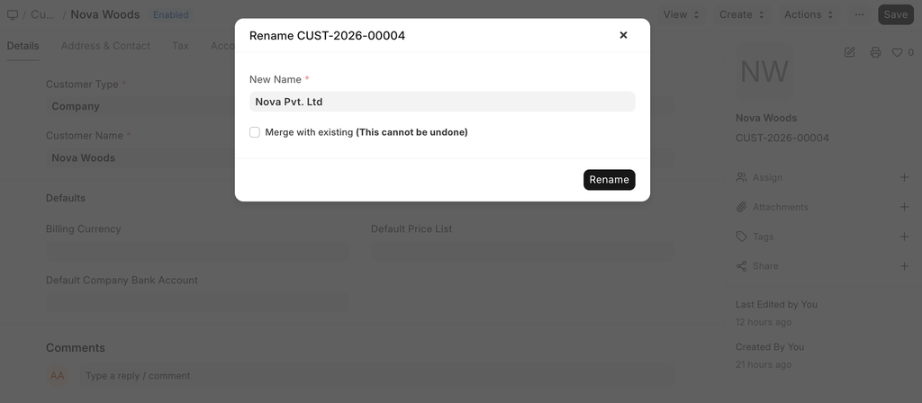 You can also merge documents by renaming them. For example, if you have a customer named Steve and a duplicate named Steve1, you can go to either of them, click on Menu > Rename, and tick the 'Merge with existing' checkbox. This will merge all the linked documents of both documents.
