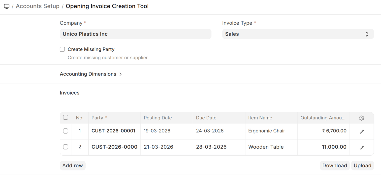 Home > Accounting > Opening and Closing > Opening Invoice Creation Tool