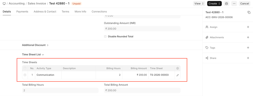 If you want to bill Employees working on Projects on an hourly basis (contract based), they can fill out Timesheets which consists of their billing rate. When you make a new Sales Invoice, select the Project for which the billing is to be made, and the corresponding Timesheet entries for that Project will be fetched.
