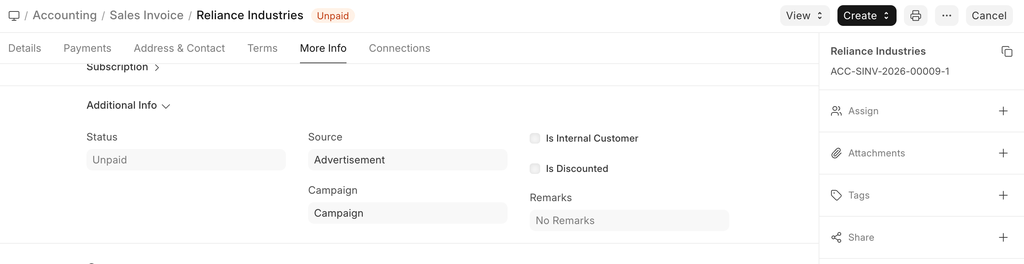 - Campaign : If this invoice is a part of on ongoing sales Campaign, it can be linked. To know more, visit the Campaign page.