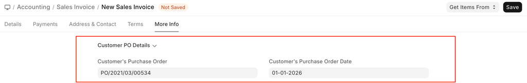 - Customer's Purchase Order : Track customer's PO No. received, primarily to prevent the creation of duplicate Sales Order or Invoice for the same PO received from the Customer. You can do more configuration related to customer's PO No. validation in Selling Settings