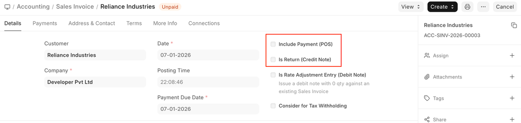 - Is Return Credit Note : Tick this if the customer has returned the Items. To know more details, visit the Credit Note page.