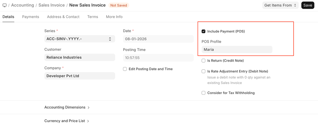 Consider a scenario where the retail transaction is carried out. For e.g: A retail shop. If you check the Is POS checkbox, then all your POS Profile data is fetched into the Sales Invoice and you can easily make payments.