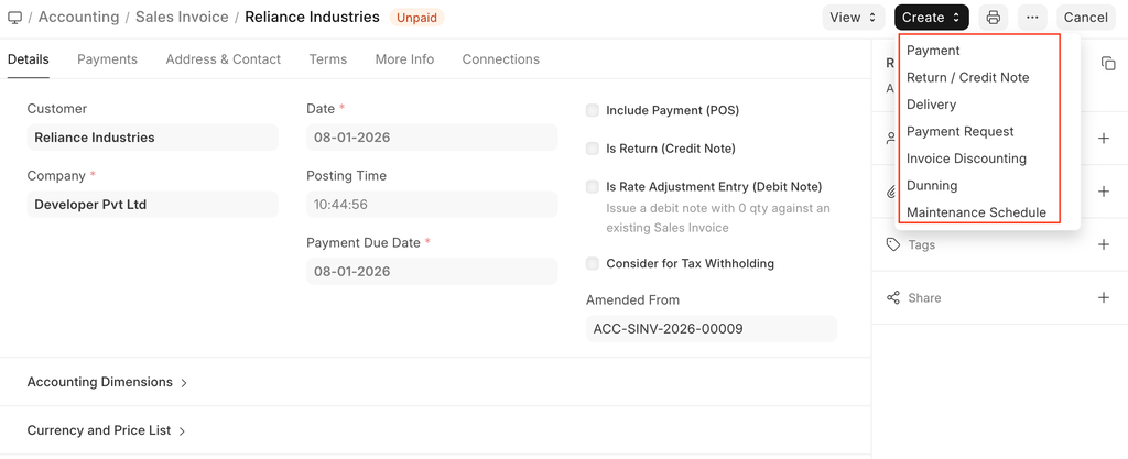 Additional options when creating a Sales Invoice