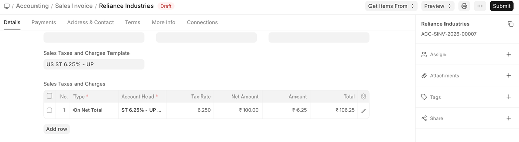 Visit the Sales Taxes and Charges Template page to know more about taxes.