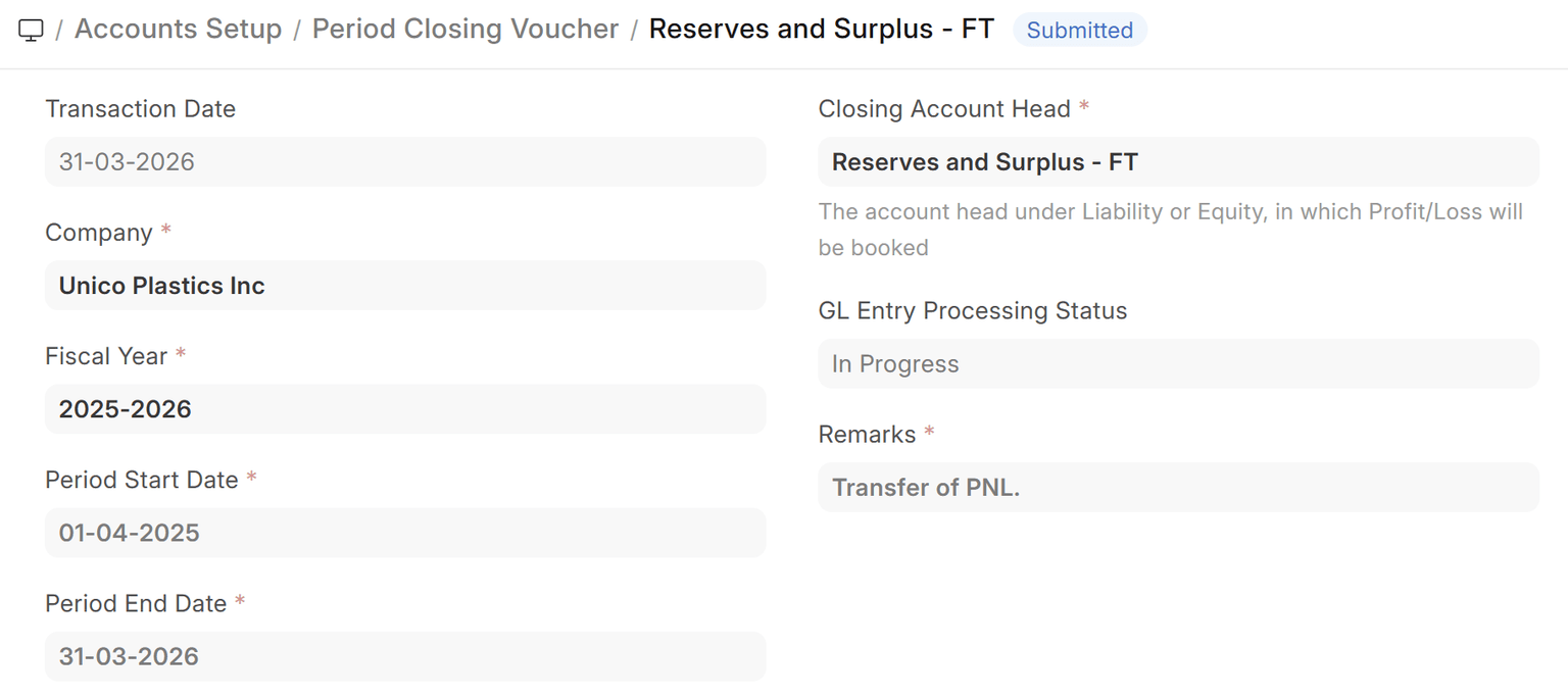 - Transaction Date will be Period Closing Voucher's creation date.