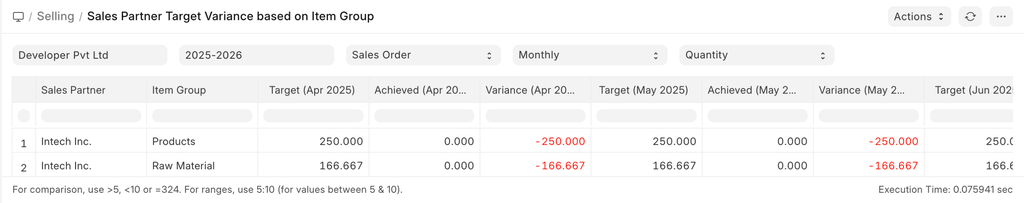 This report will provide you variance between target and actual performance of the Sales Partner based on the Sales Order / Sales Invoice / Delivery Note data. User can view this report period wise like Monthly, Quarterly, Half-Yearly, or Yearly.