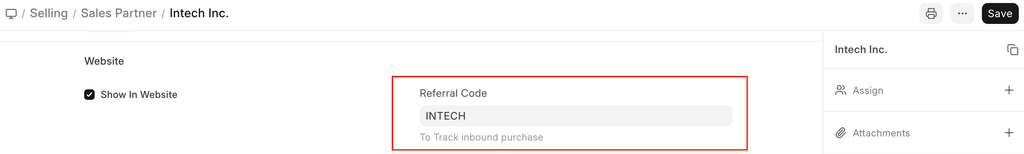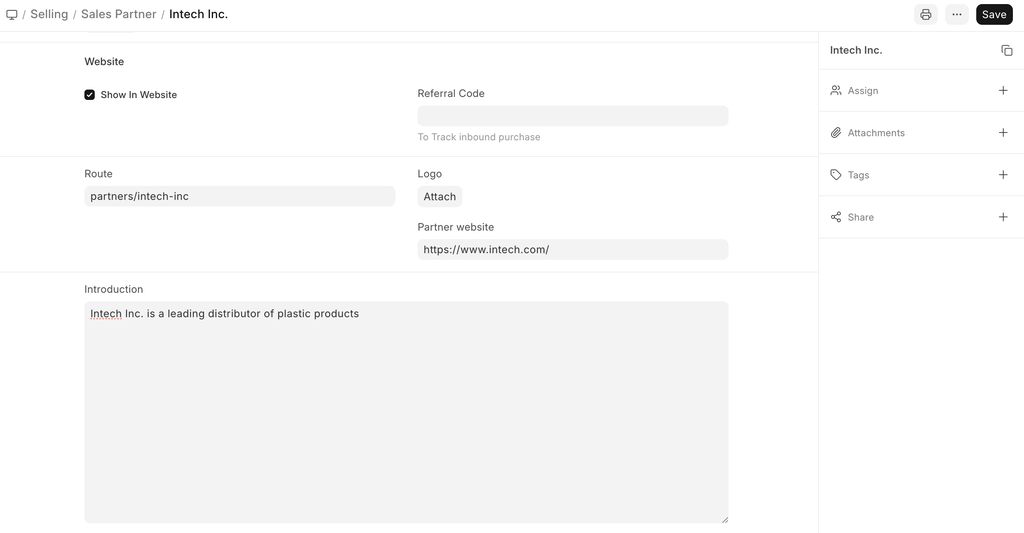 To include the name of your Partner on your website, tick the "Show in Website" checkbox. When you click on "Show in Website", you will see a field where you can attach the logo of your partner's company and enter a brief introduction of the partner, and optionally add a description for internal purposes/references.