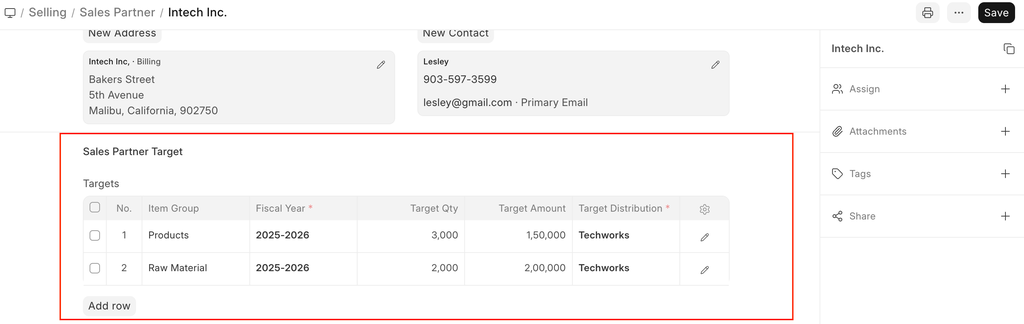 You can add and track a Sales Partner's Addresses and Contact details. These can be added in the Address & Contacts section in a Sales Partner: