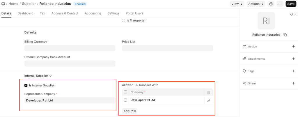 - In the table Allowed To Transact With for the Supplier, add the company which the Customer represents. This is the company against which you are going to make an inter-linked Purchase Invoice.