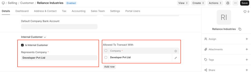 - Enable the checkbox, Is Internal Customer shown as follows: