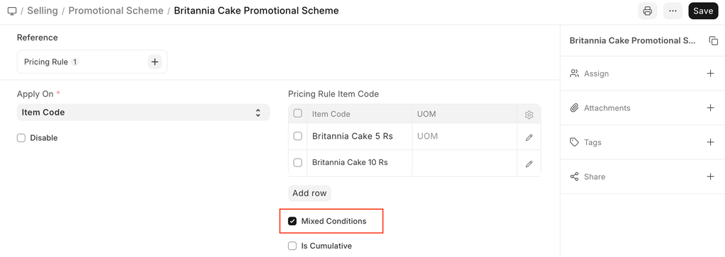 - Set the item code Britannia Cake 5 Rs, Britannia Cake 10 Rs in the Pricing Rule Item Code table.