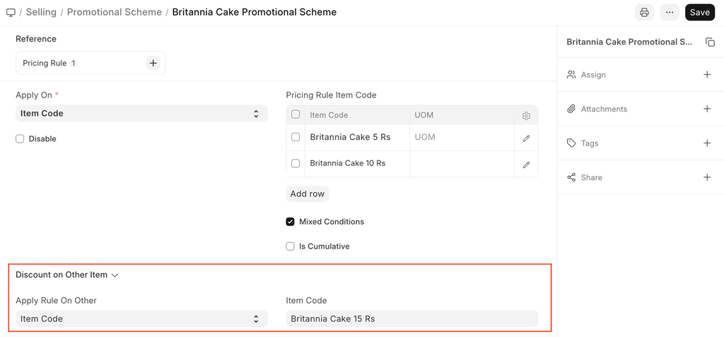 - Apply Rule On Other as Item Code and set Item Code as Britannia Cake 15 Rs.