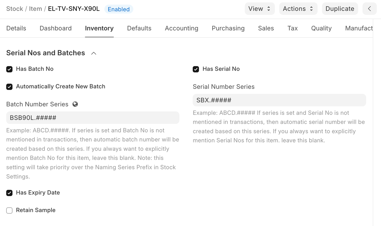 - Has Serial No : This is similar to the Batch Number Series; it'll be created when you make transactions/manufacture. If you set Serial Number Series as AA, then on the first transaction, a serial number like AA00001 will be created.