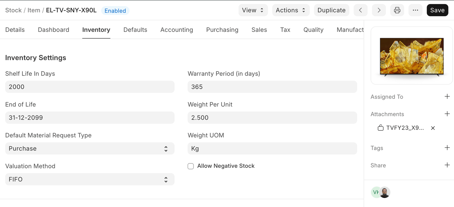 - Allow negative stock : When checked, the item will be allowed to go negative even if negative stock is disabled from Stock Settings. This is useful if you don't want to enable negative stock on high-value items, but a few select low-value items are allowed to go negative for a few days.