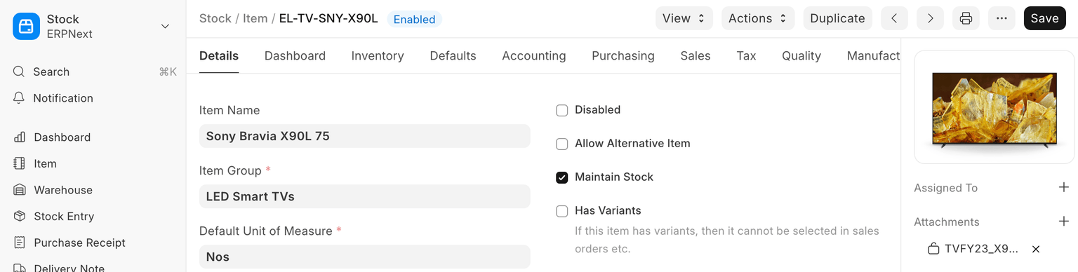 - Maintain Stock: If you are maintaining stock of this Item in your Inventory, ERPNext will make a stock ledger entry for each transaction of this item. Ensure to keep this option unchecked when creating a non-stock Item (make to order/engineer) or a service.