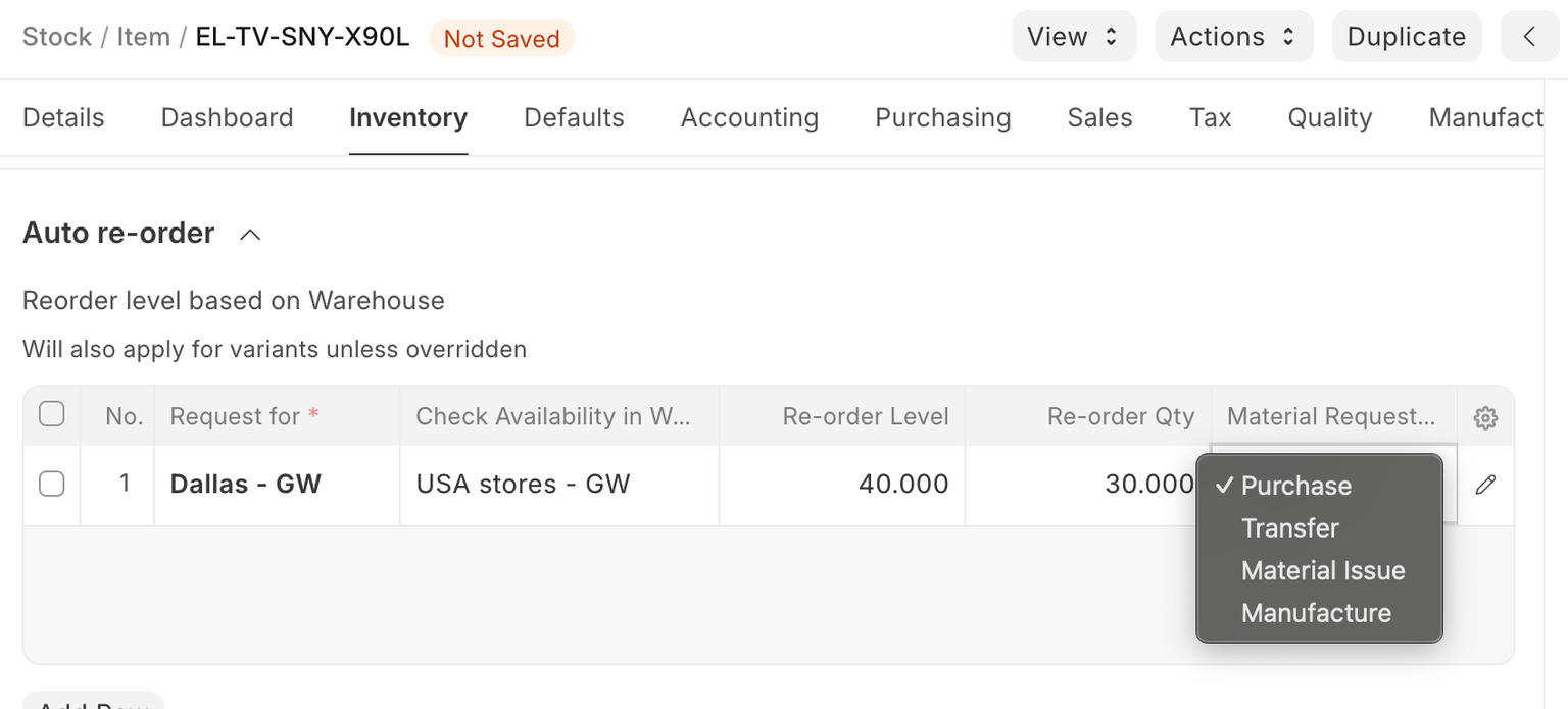 - Material Request Type : The Material Request type with which the stock will be reordered. This depends on whether you buy the Item, manufacture it yourself or transfer it between Warehouses.