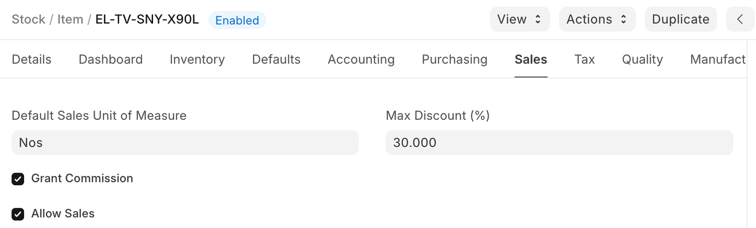 - Grant Commission : Grant a commission to Sales Person and Sales Partner when this item is sold. If disabled, the sales generated by this item will be ignored in the calculation of commission.