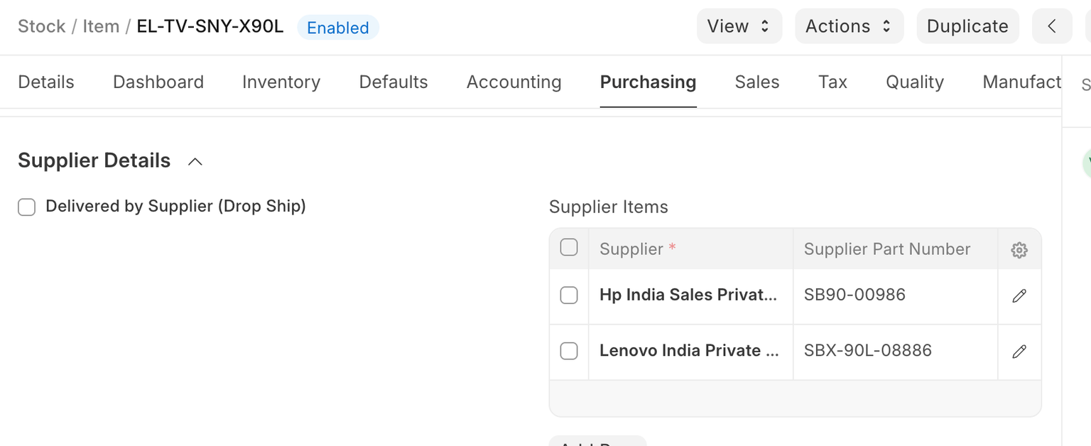 - Delivered by Supplier (Drop Ship) : If the item is delivered directly by the supplier to the customer, tick this checkbox. Read more here.