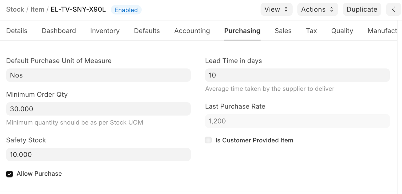 - Inspection Required before Purchase : If an inspection is mandatory before the item is purchased, i.e., before you generate Purchase Receipt, tick this checkbox.
