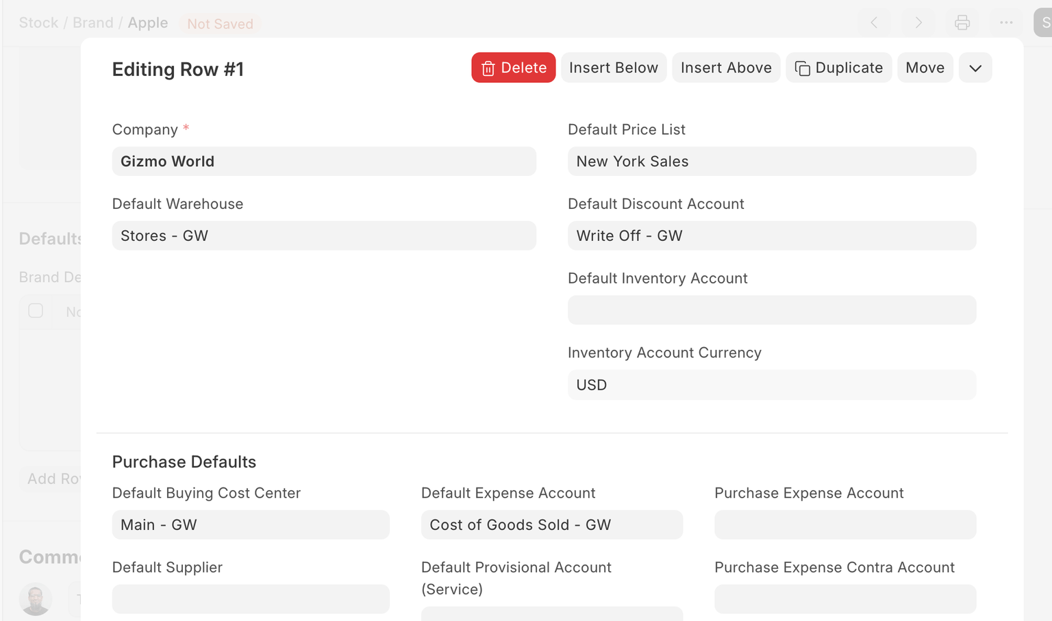 When performing Purchase transactions like Purchase Order, Purchase Receipt, or Purchase Invoice, the defaults set here will be fetched on selecting Item of this Brand.