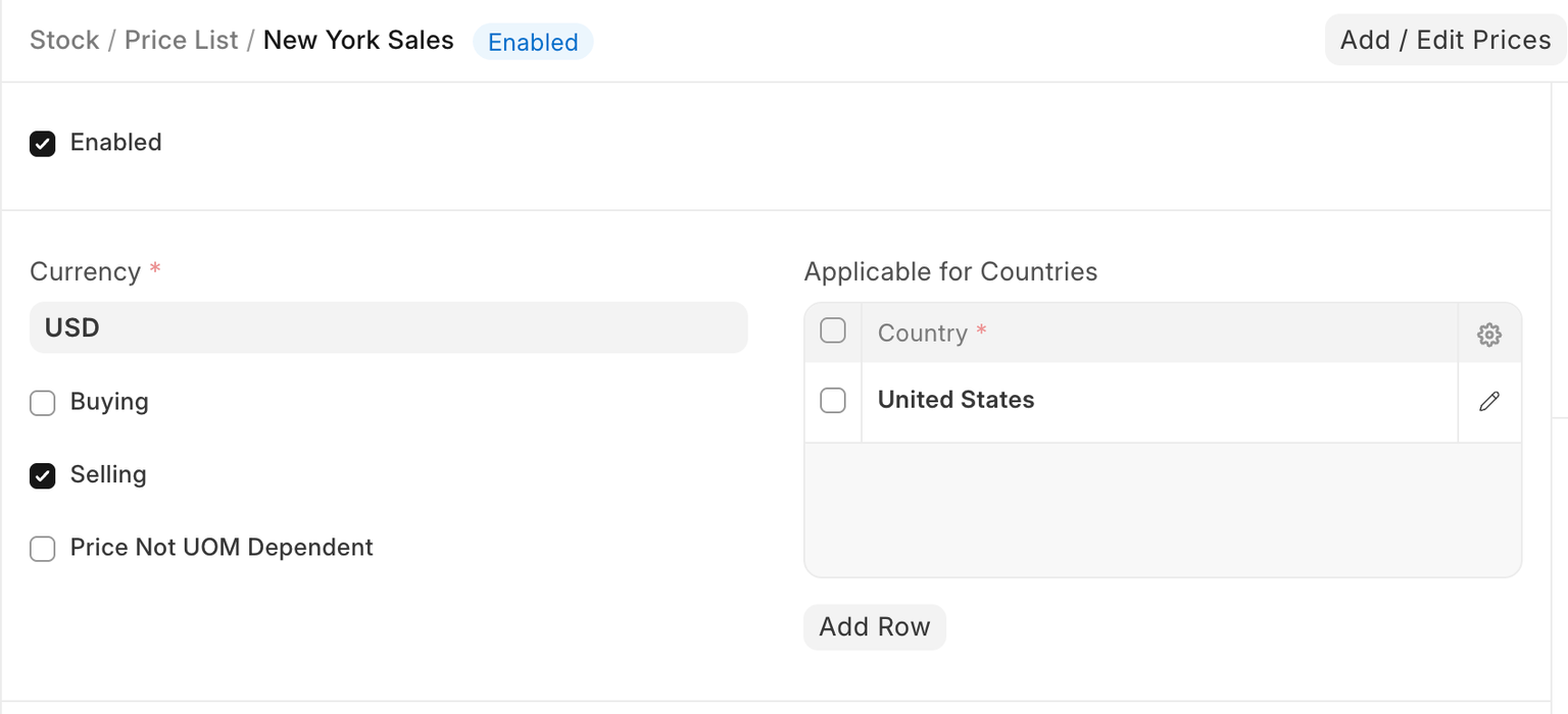 - To disable a specific Price List, untick the 'Enabled' checkbox. The Disabled Price List will not be available for selection in the Sales and Purchase transactions.