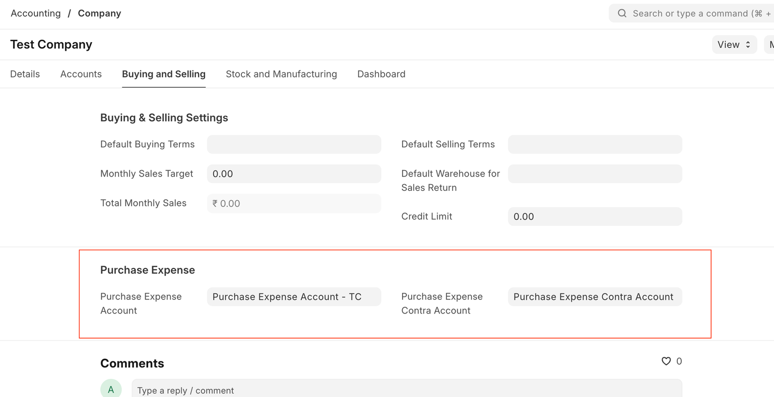 Users can configure the default purchase expense and default purchase expense contra account in the company master