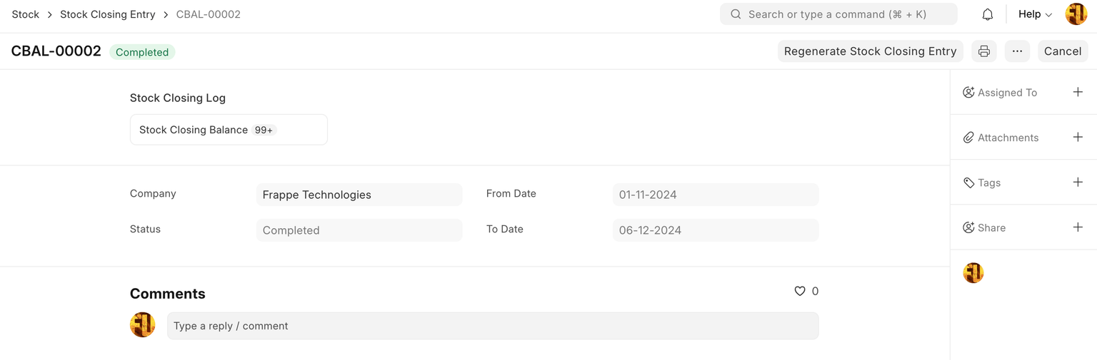 The user is required to create a stock closing entry for the desired period, which can span one month, half a month, or an entire year. Upon submission of the stock closing entry, the system generates the stock closing balance for the selected period, including item, batch, inventory dimensions and warehouse wise consolidated closing stock quantities and stock values.