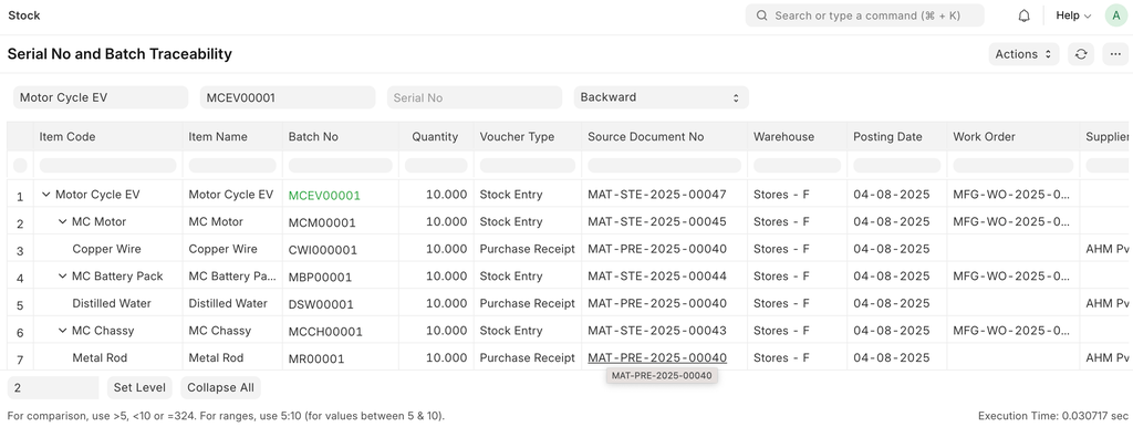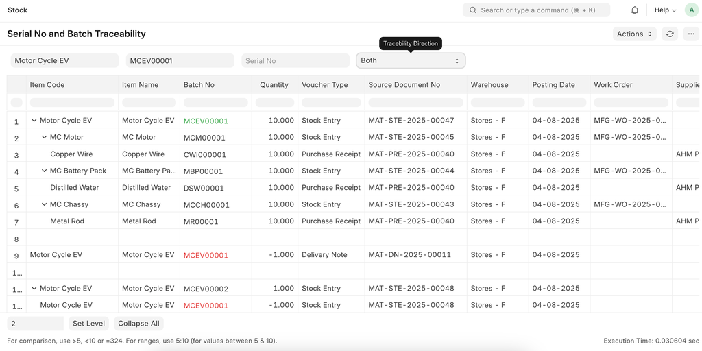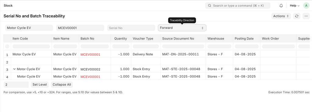 The Serial and Batch Traceability Report is used to track the full movement and lifecycle of serialized or batched items across your supply chain. Thre are two types of traceability methods