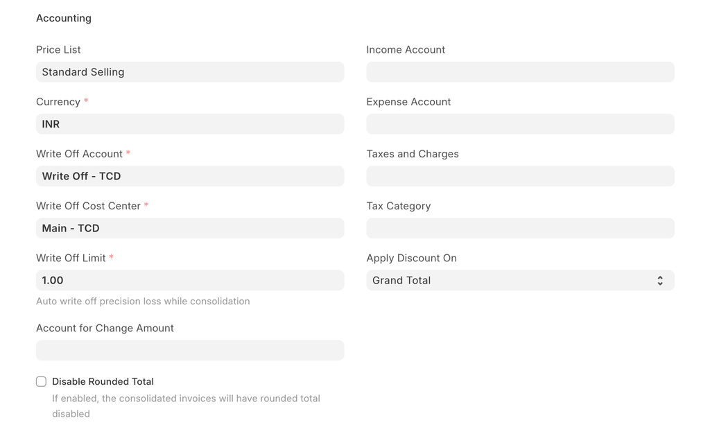 - Set Currency, Write Off Account, Write Off Cost Center and Write Off Limit.