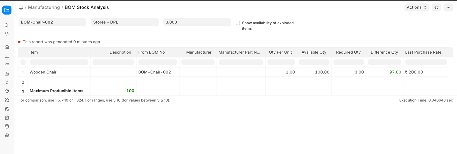 BOM Stock Analysis is a manufacturing report in ERPNext that tells you, for a given Bill of Materials (BOM), whether you have enough raw materials to fulfill a production run.