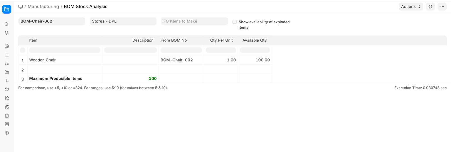 This mode can be used for quick answers to questions like - "How many finished goods can we make right now?" without specifying the production target. To enter this mode, we leave the Fg Item to Make empty and define the warehouse and BOM.