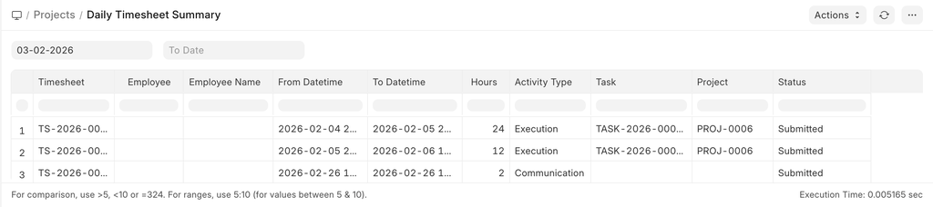 The Daily Timesheet Summary provides a consolidated view of all tasks recorded in a timesheet for a selected time period. It displays the timesheet activities along with the logged hours and the corresponding linked tasks and projects, enabling users to review daily time allocation at a glance.
