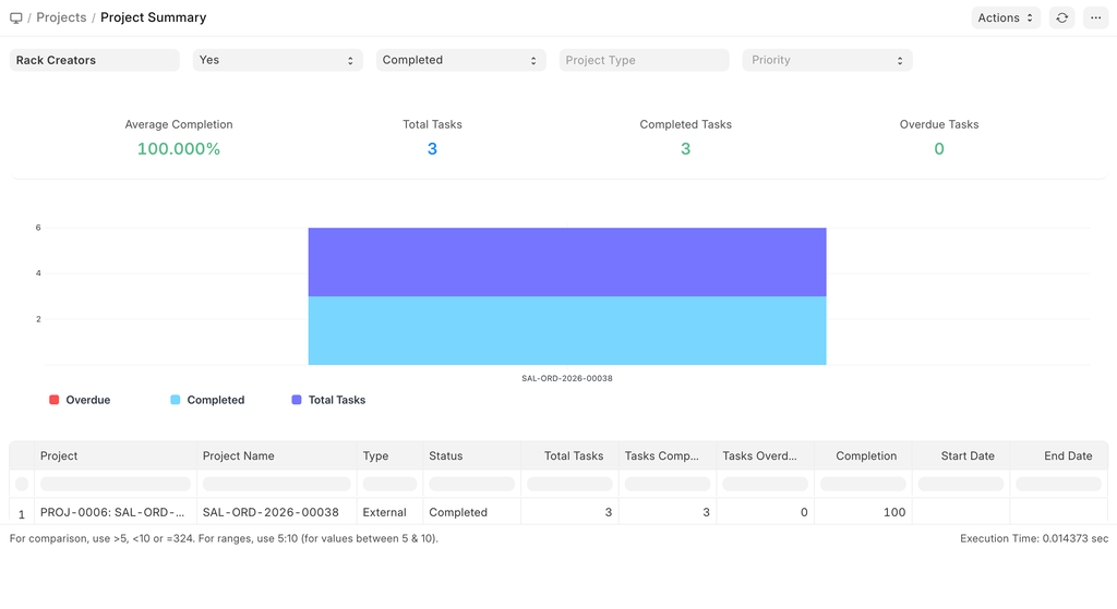 The Project Summary provides an overview of key project information, including the current project status, start and end dates, and a consolidated view of related records. It displays the number of associated Tasks and Timesheets , allowing users to quickly assess project progress and activity at a glance.