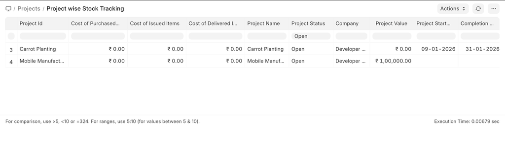 This report provides visibility into stock movements associated with projects, including purchased items and issued items. It also displays key project information such as the project status, total project value, and the project start and completion dates, enabling effective tracking of material usage and overall project progress.