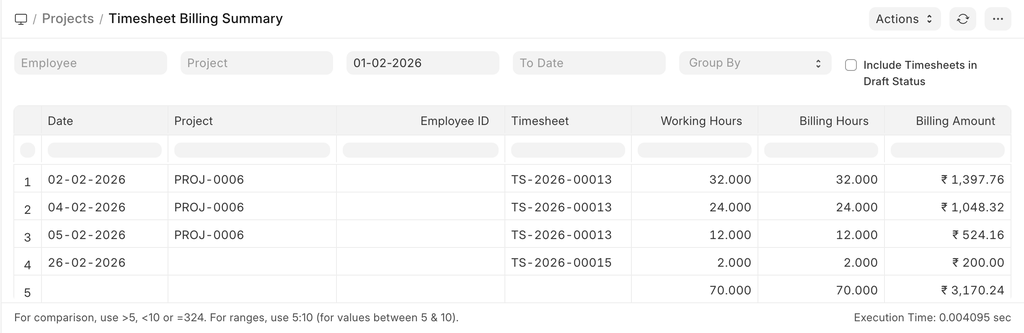 This report provides a summary of timesheet-based billing for a selected time period. It displays the total working hours along with the corresponding billable hours, billing rates, and calculated billing amounts, enabling users to review and analyze time-and-material billing at a glance.
