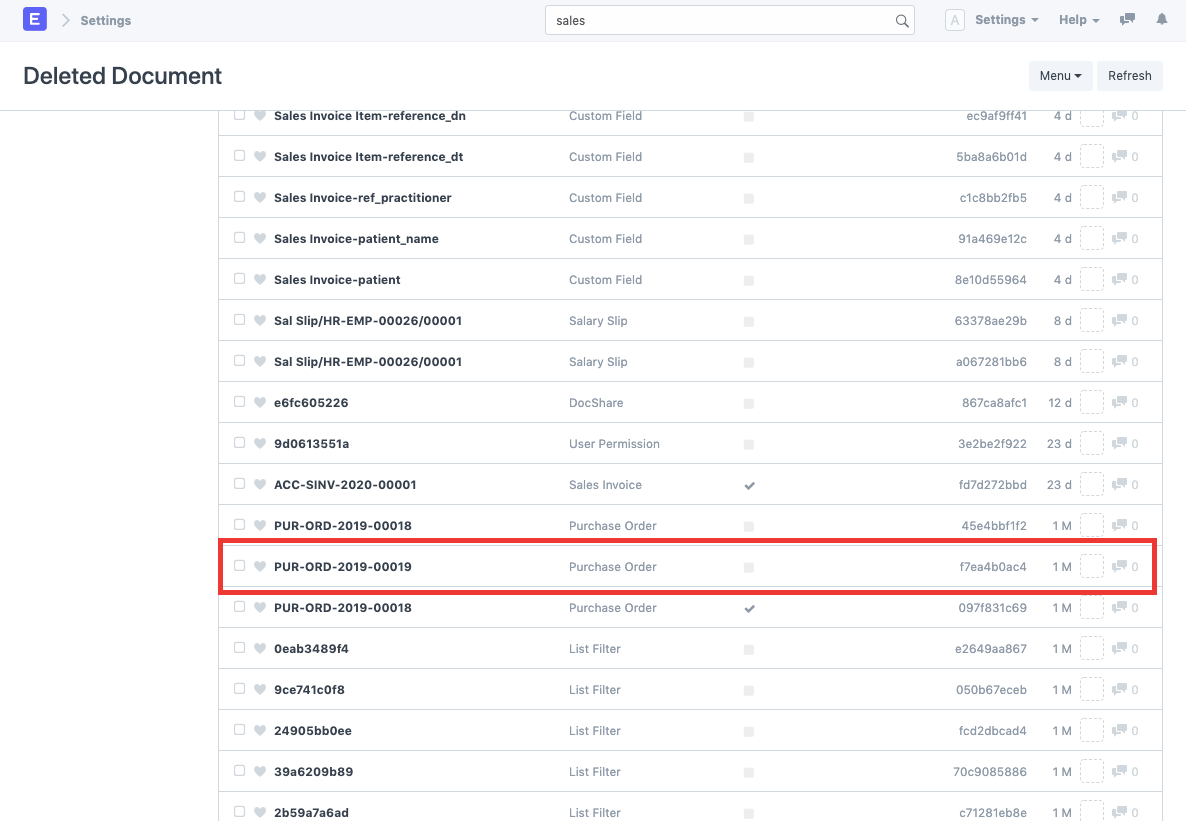 - Search for the deleted document. You can also filter out the document based on the Deleted DocType. For example we need to restore the Purchase Order, PUR-ORD-2019-00019. To do so, search for the same in the deleted document list and open it.