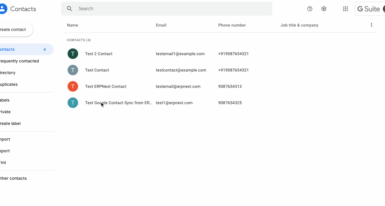 - Once Google Contacts Integration is succesful, all the contacts created in ERPNext will be synced if